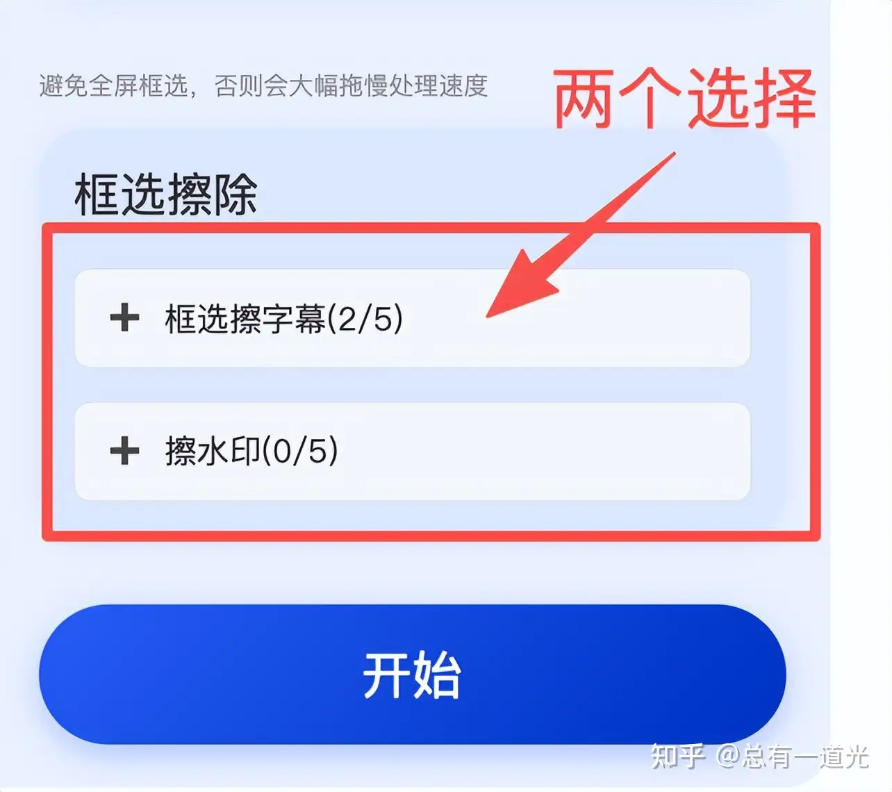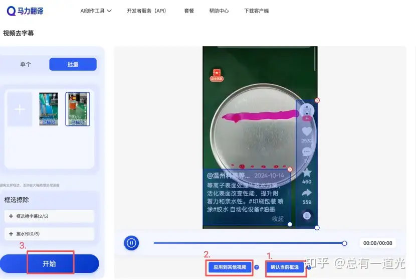 - 一键同步批量处理:先点击【确认当前框选】核对区域,再点击【应用到其他视频】,框选设置会一键同步到所有批量上传的素材,不用逐一条调整,最后点击【开始】,系统自动完成批量视频去水印;