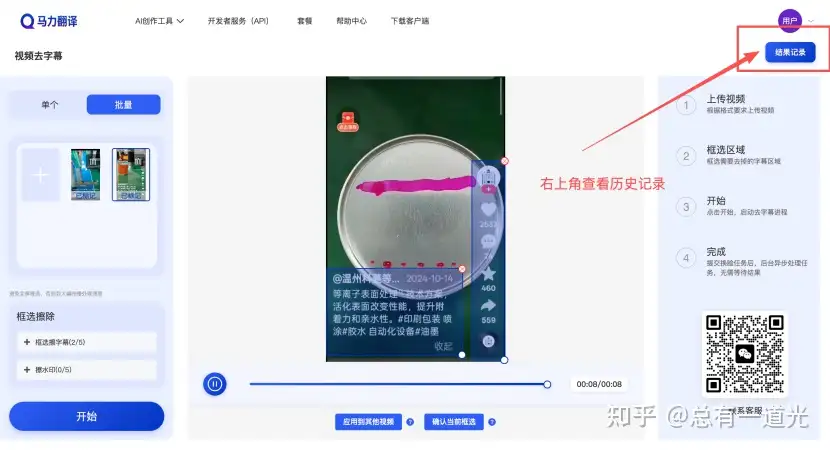 - 批量导出成品:处理完成后,在页面右上角【历史记录】里,就能批量下载无水印视频,全程不用值守,几十条视频最快几分钟就能全部处理完。